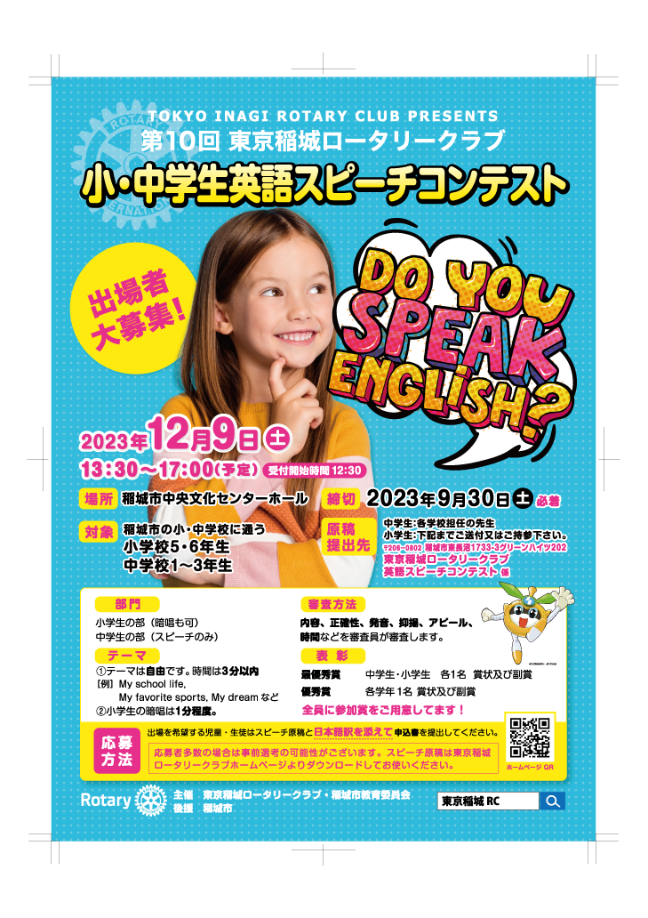 Let’s Challenge!! 東京稲城ロータリークラブでは、昨年に引き続き第10回小中学生英語スピーチコンテストを開催いたします。 当コンテストはロータリークラブの奉仕の精神における青少年奉仕の一環として開催し […] -