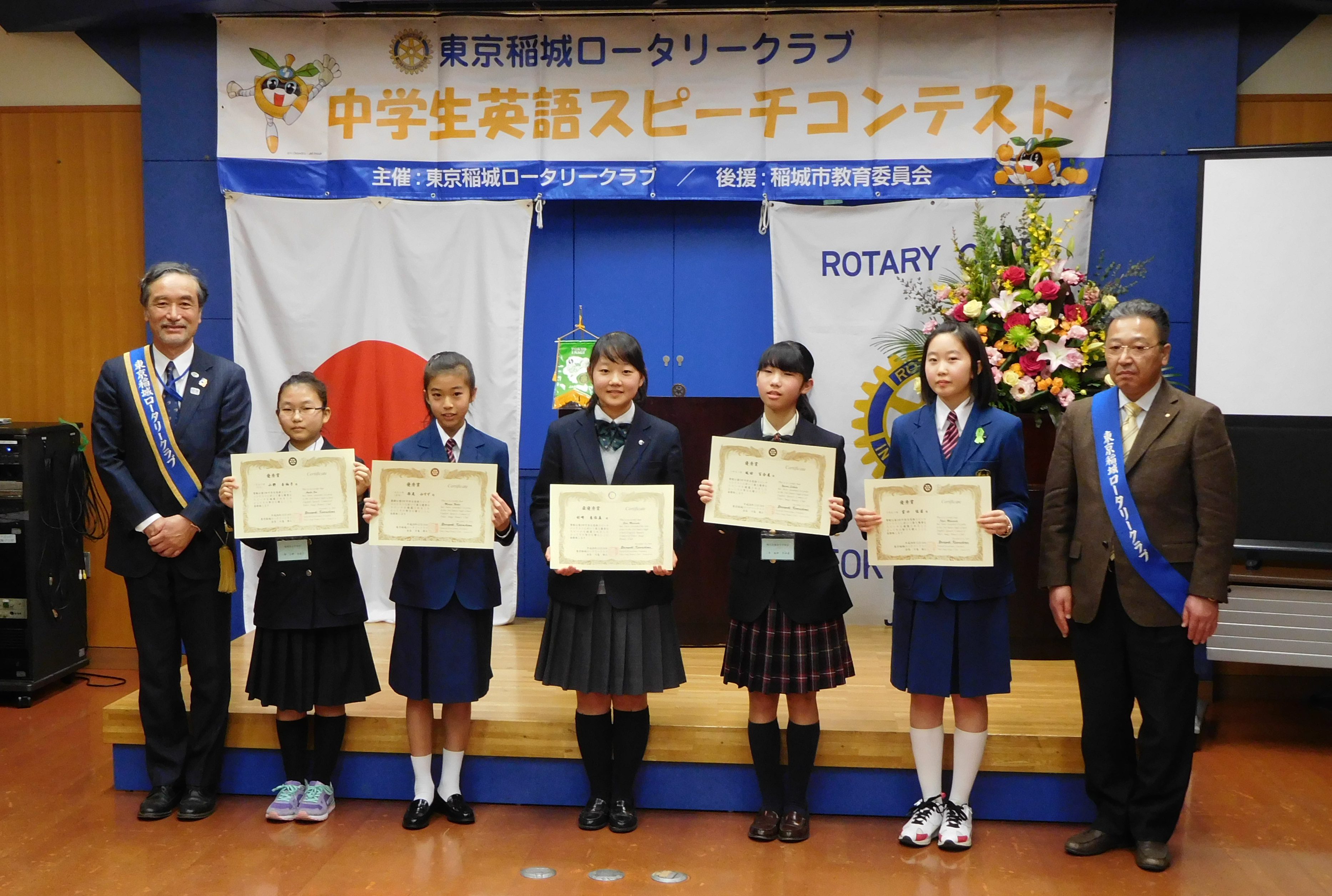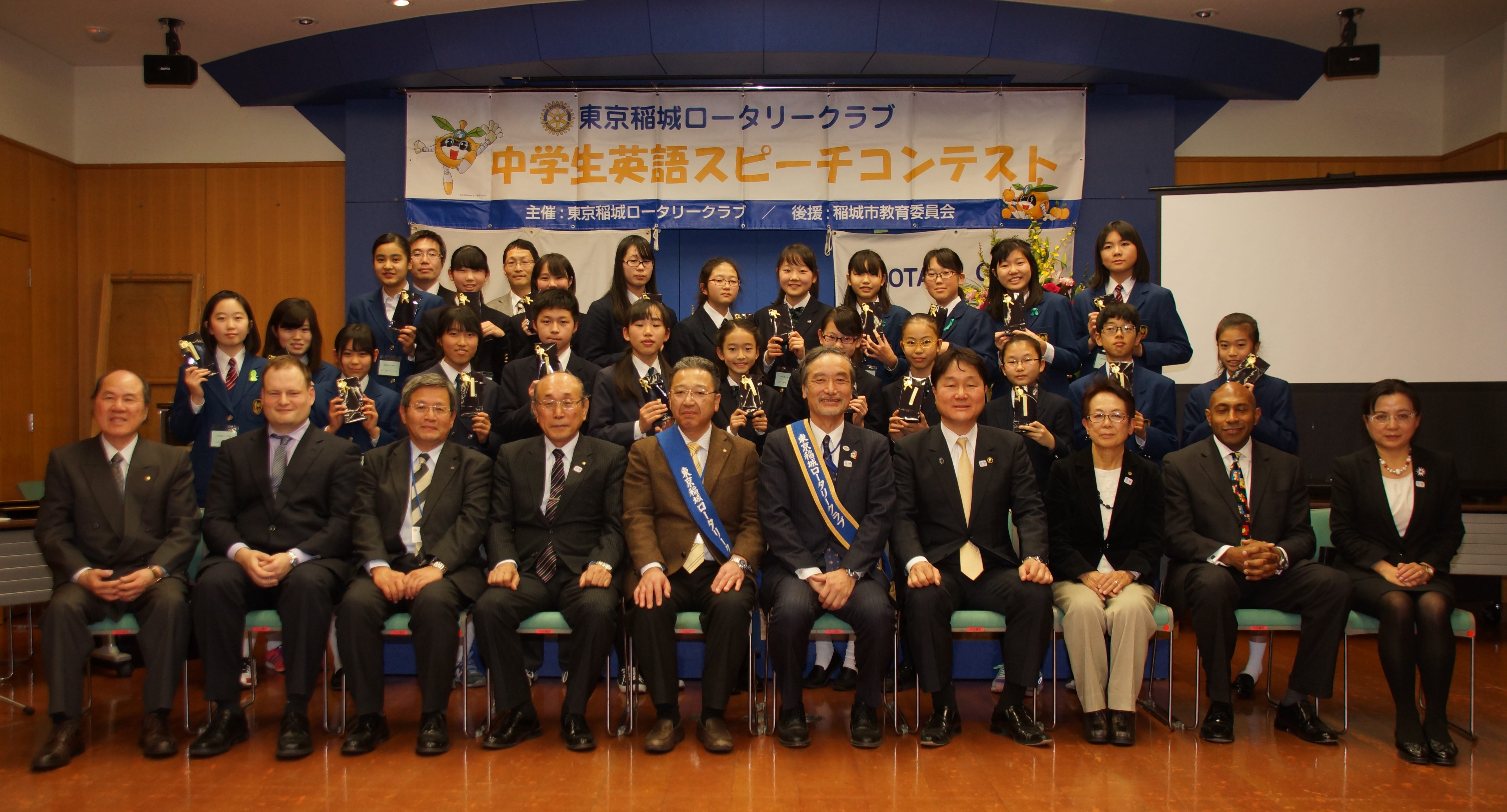 第3回中学生英語スピーチコンテストを開催! 投稿日 2017年2月6日 更新日 2019年4月10日 著者 東京稲城 ロータリークラブ カテゴリー 活動報告 2016年12月10日(土)稲城市地域振興プラザにおいて第三回中学生英語スピーチコンテストを開催しました。 今年度は稲城市立中学校と駒沢学園女子中学校から五校と立川市立中学校から一校、併せて六校より参加がありました。 参加生徒の内訳は一年生6名(内暗誦の部2名)、二年生9名、三年生7名 計23名の生徒達が参加しました。 発表の様子。 受賞者の皆さんと2016-17年度当クラブ川島会長、渋谷幹事。 この記事を書いた人 東京稲城 ロータリークラブ 記事一覧
