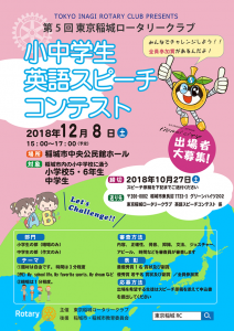 東京稲城ロータリークラブでは、昨年に引き続き第5回小中学生英語スピーチコンテストを開催いたします。今回からは小学生も対象になりました。