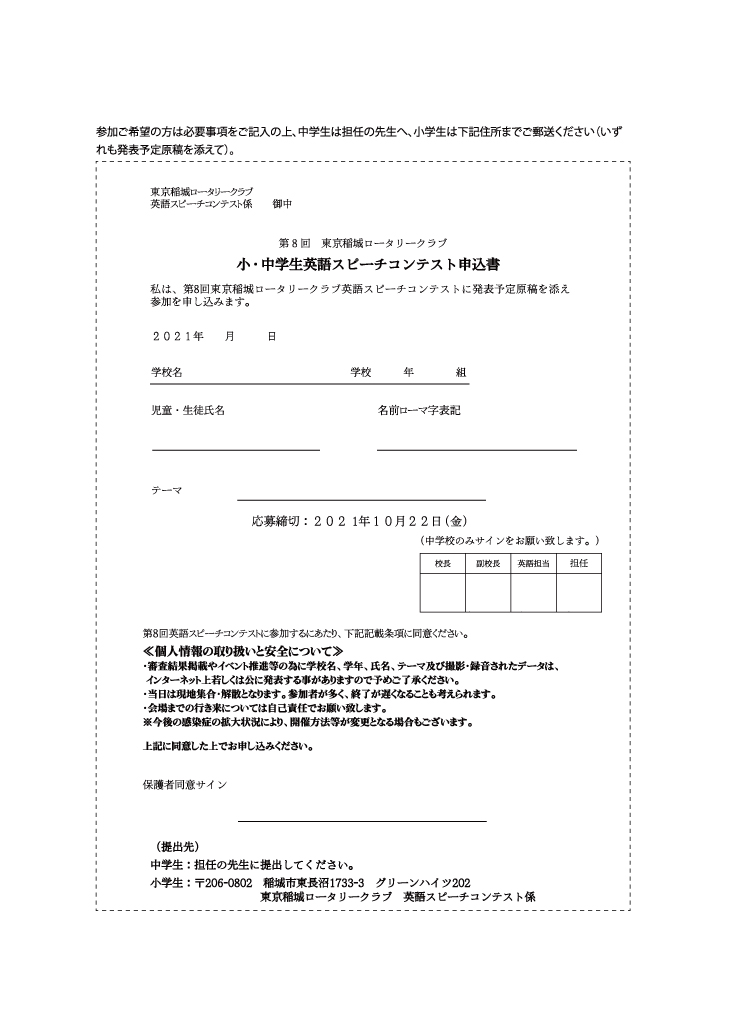 ※小学生の申込は、申込書に必要事項と保護者サインをご記入の上、発表原稿を添えて東京稲城ロータリークラブ事務局宛(住所は申込書に記載)にご郵送ください。